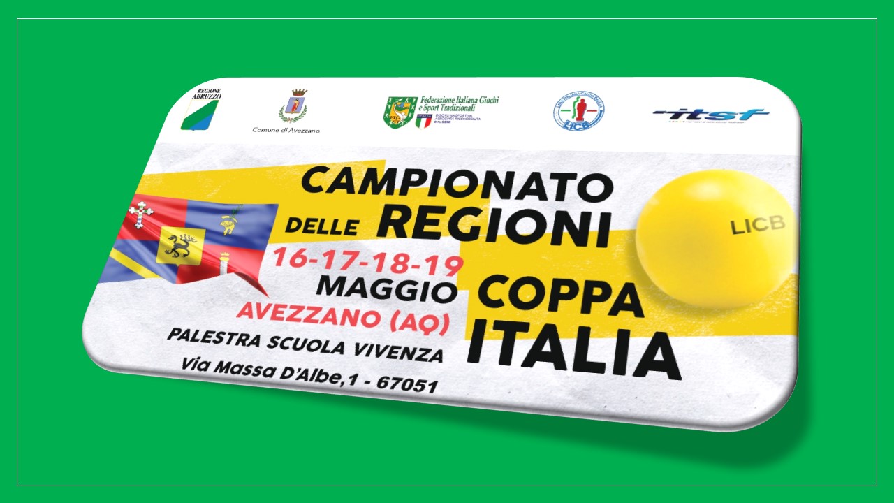DOPPIO APPUNTAMENTO IN TERRA D’ABRUZZO PER IL CALCIO BALILLA: AD AVEZZANO CAMPIONATO REGIONI E COPPA ITALIA La Federazione Italiana Giochi e Sport Tradizionali e la Lega Italiana Calcio Balilla organizzano quattro giorni di sport e spettacolo dal 16 al 19 maggio. Tra le iniziative collater...