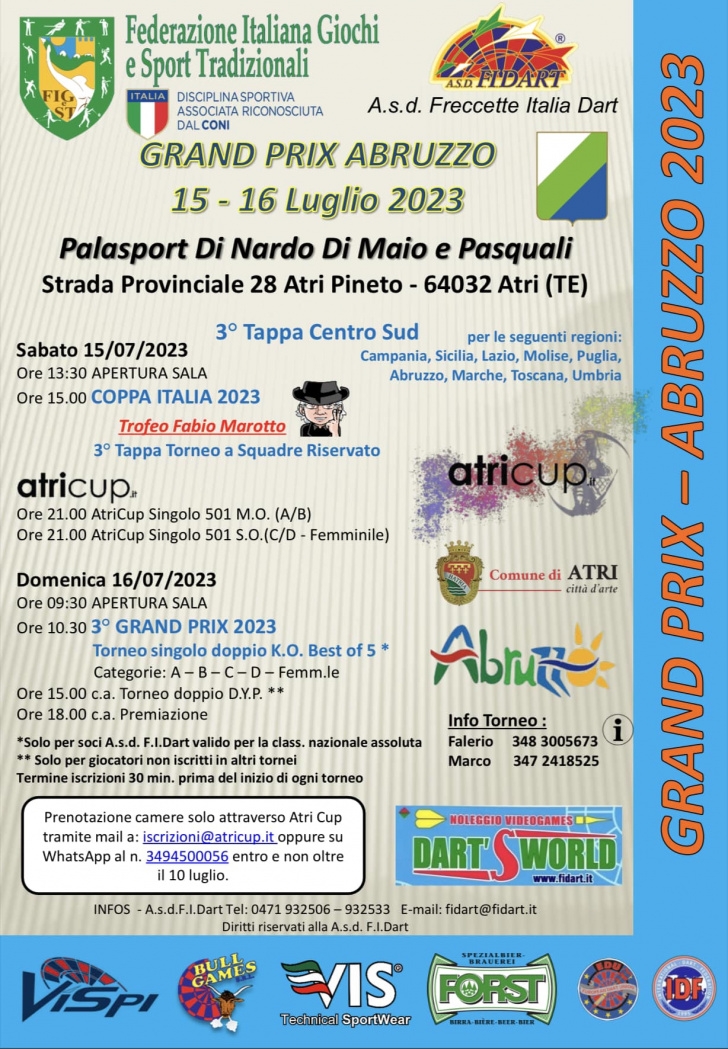 Torna il Grand Prix d’Abruzzo di freccette. L’appuntamento si terrà nel fine settimana (sabato 15 e domenica 16 luglio) al palasport Di Nardo Di Maio e Pasquali ad Atri, in provincia di Teramo.