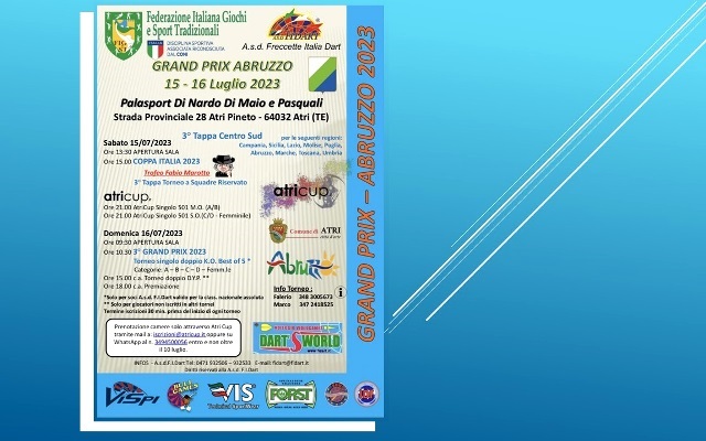 Torna il Grand Prix d’Abruzzo di freccette. L’appuntamento si terrà nel fine settimana (sabato 15 e domenica 16 luglio) al palasport Di Nardo Di Maio e Pasquali ad Atri, in provincia di Teramo. L’evento sportivo, promosso dall’Asd Freccette Italia Dart con l’egida della Figest, la Federazi...